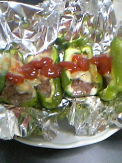 今日の夕食、レンジでチン☆手抜きピーマンの肉詰め~♪